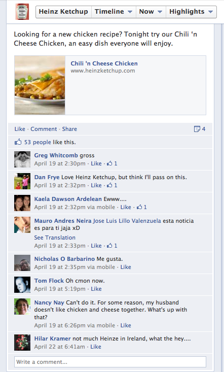 How does this help Heinz’s revenue? I’m sure it doesn’t. Since it probably doesn’t cost Heinz much to answer questions on its Facebook page, why not keep doing it? Because it’s a NOP. You could pay that person to drive around a funky car with a giant ketchup bottle sticking out the back, and hand out ketchup to teens. Seems to work for Red Bull. Seriously, paying somebody to answer inane questions on Facebook does not generate revenue so just say no!